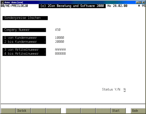 Wenn Sie das Programm unter SCOPE aufgerufen haben (unser Beispiel), geben Sie zunächst die Company-Nummer ein. Danach werden die weiteren Felder sequentiell abgefragt. Vom Statusfeld aus können Sie die einzelnen Felder über die Anwahl der entsprechenden Nummer nochmals ändern. Status N erlaubt die nochmalige Anwahl aller Felder. Über Status Y oder Softkey Start beginnen Sie mit der Verarbeitung. Während der Verarbeitung wird der aktuelle Datensatz in einem Fenster angezeigt. Über Rasttaste R1 können Sie einen Zähler der gelöschten Sätze einblenden. Über CTRL-B kann der Programmlauf abgebrochen werden. Mit Ende beenden Sie das Programm ohne Verarbeitung.